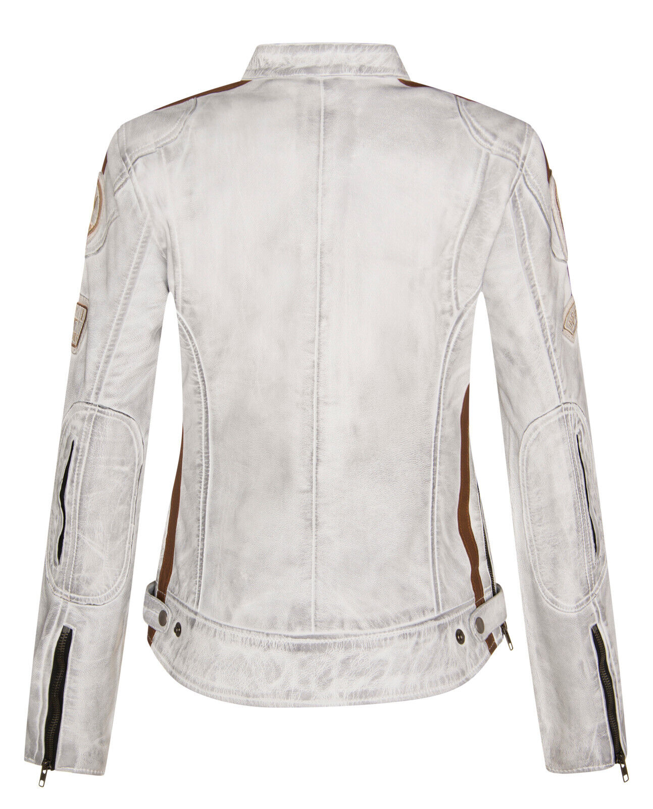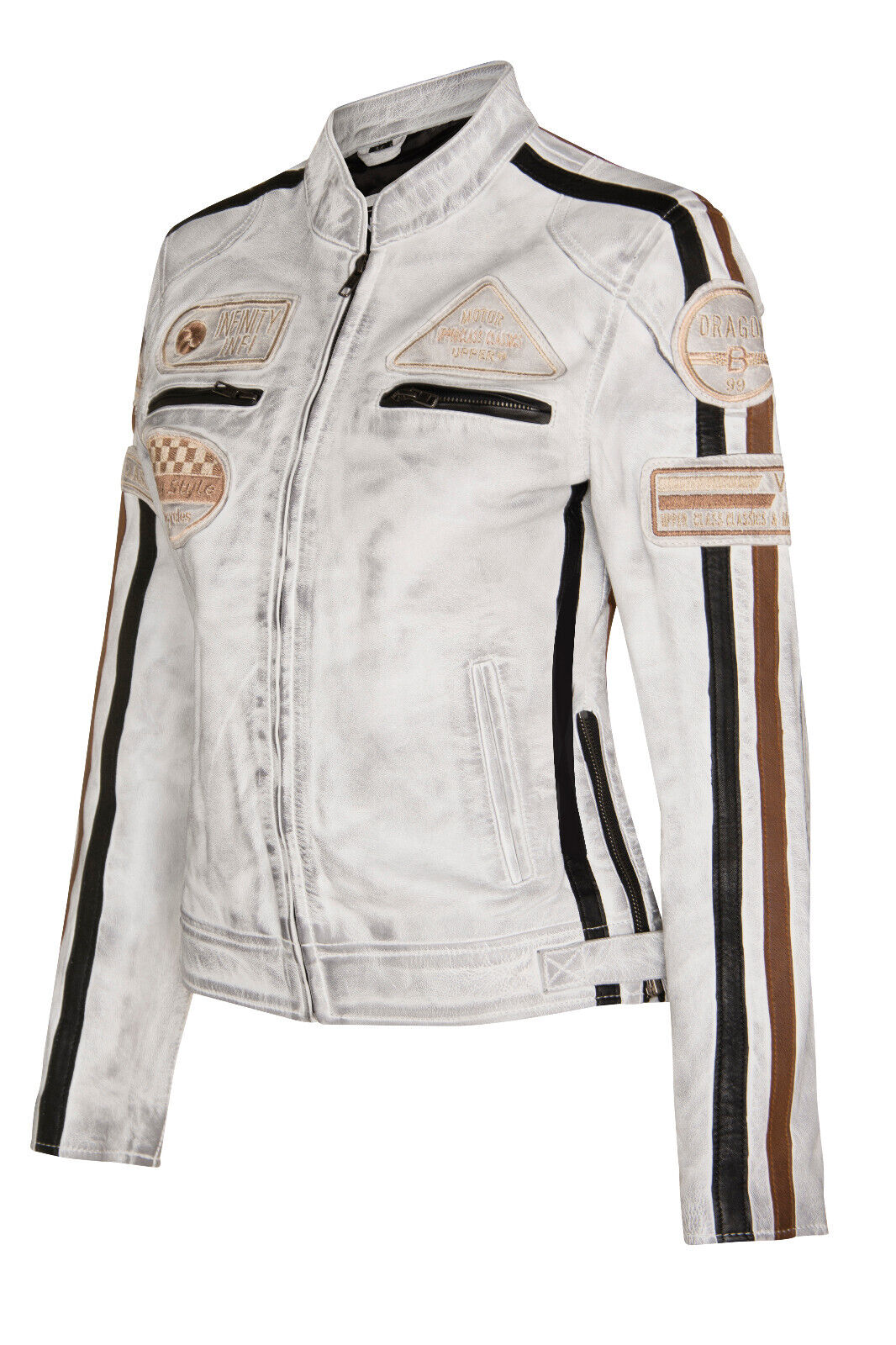 Women’s Real Leather Biker Jacket White Color Zipper Closure Racing Style Windproof Lambskin Jacket With Moto Badges
